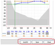 Once In-Situ Audiometry is complete, selecting, “Auto Fit,” will recalculate instrument(s) program settings, or choosing “Save” and “Close,” stores In-Situ results, with an option to recalculate at a later time.